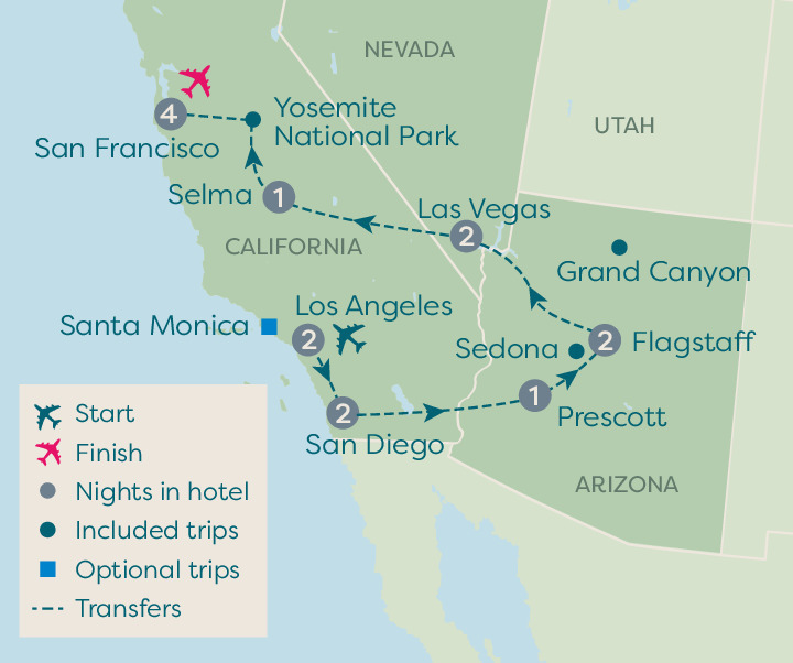 Today we'll leave California on a drive that takes us through a spectacular desert landscape filled with distinctive, tree-like Saguaro cactus plants. We’re heading into Arizona and will make our way to the town of Prescott. At over 1,500 metres above sea level, this former Wild-West town is set amongst evergreen forests and shimmering lakes.